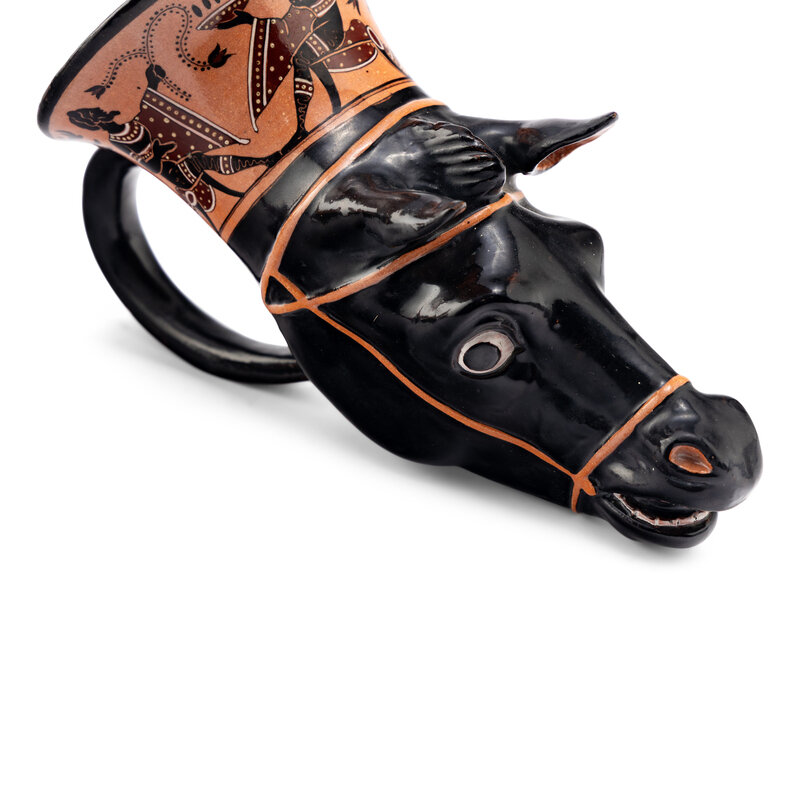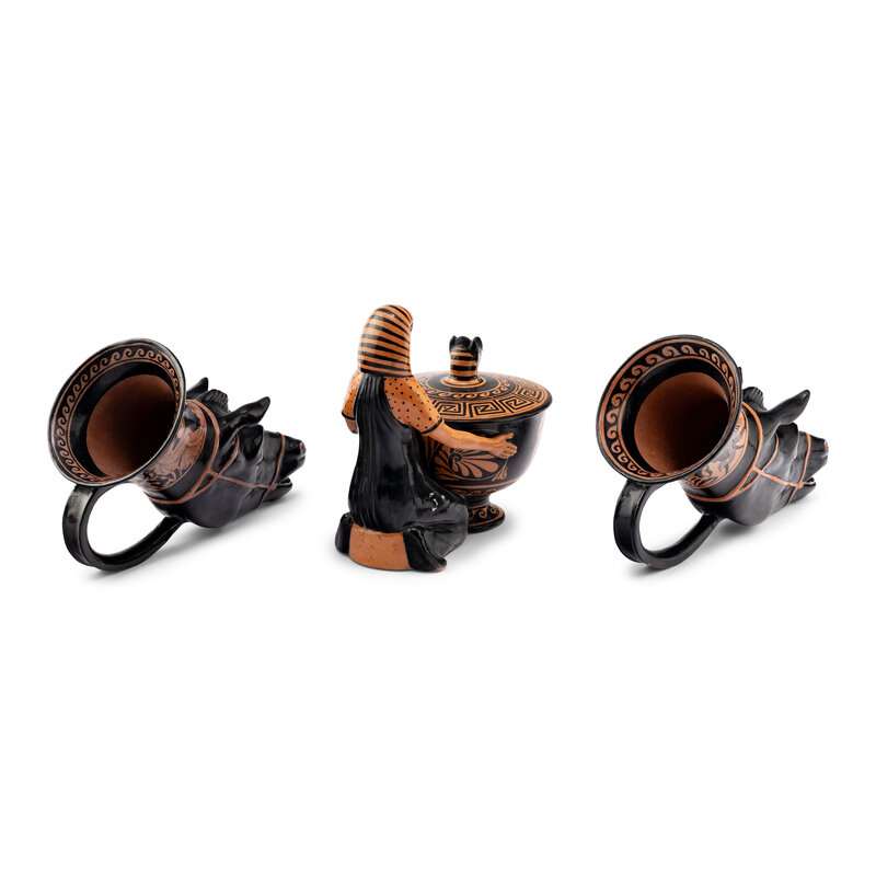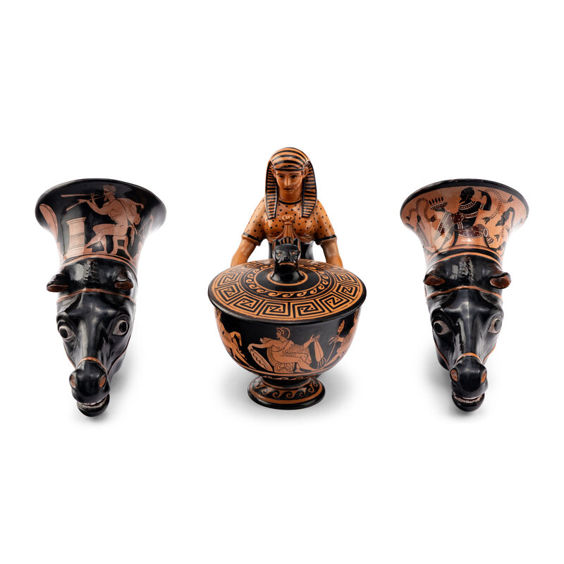 comprising a Giustiniani pyxis with a female figure and a pair of rhyton cups.