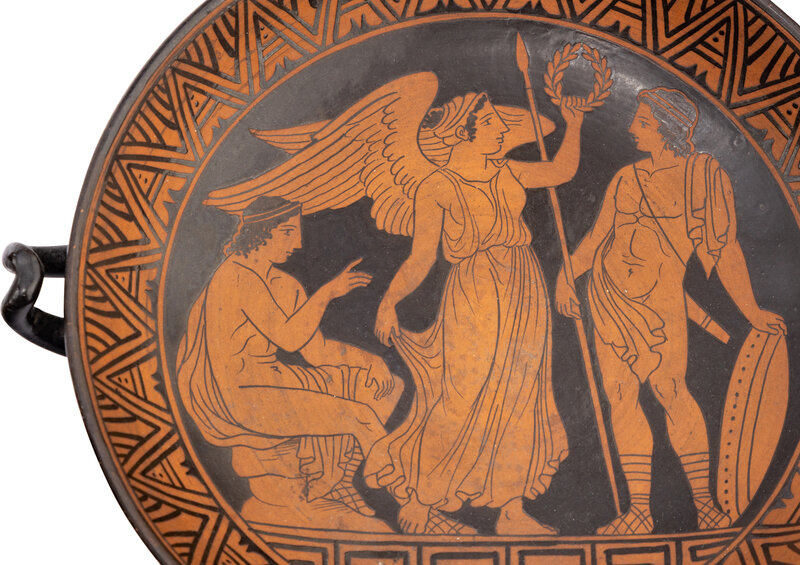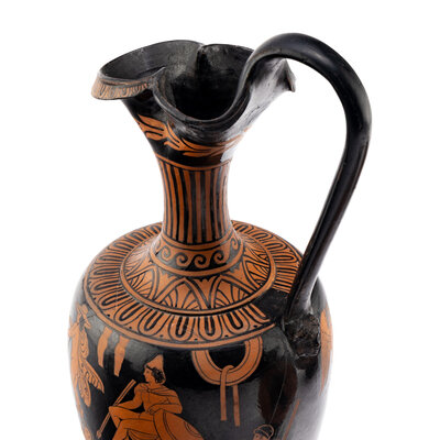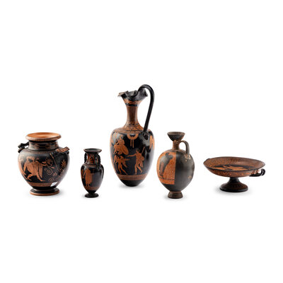 comprising a lekythos, a trefoil oinochoe, an amphora with twisted handles, a stamnos, and a kylix; stamnos incised to underside: 282. F&JG. 1543.