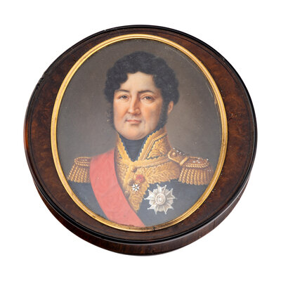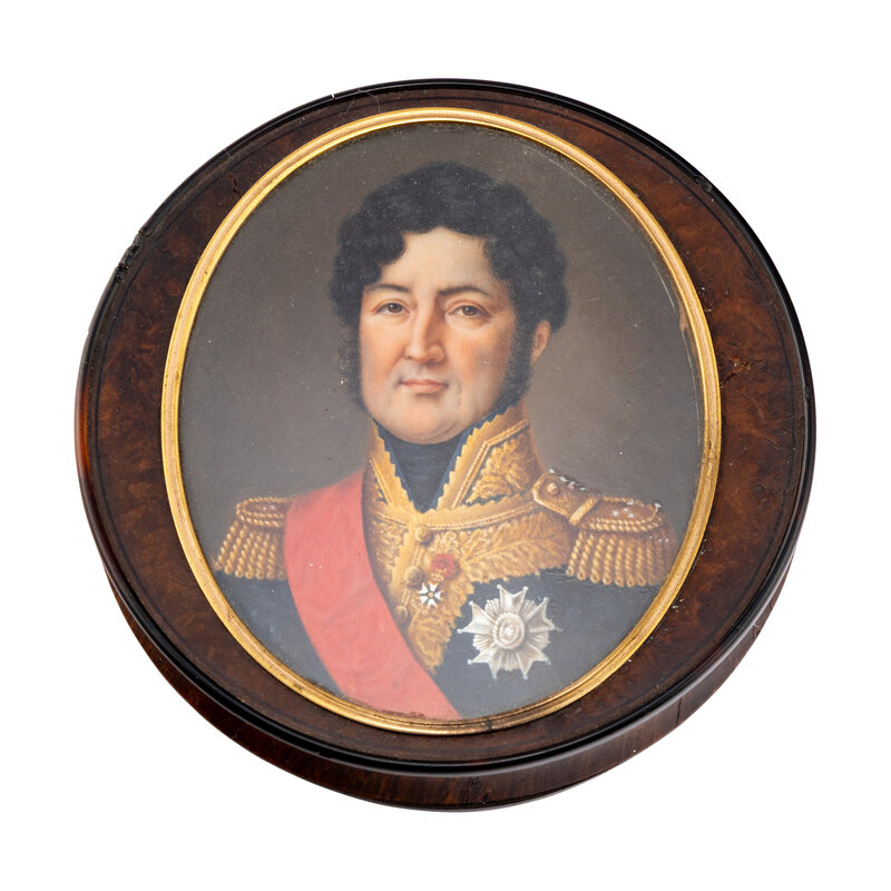 comprising one example depicting King Louis Philippe inset in a tortoise shell veneered snuff box, one portrait of an officer engraved 'Robert 1st Lord Clive' verso, and one unidentified officer.