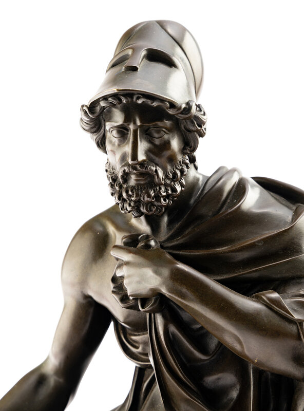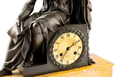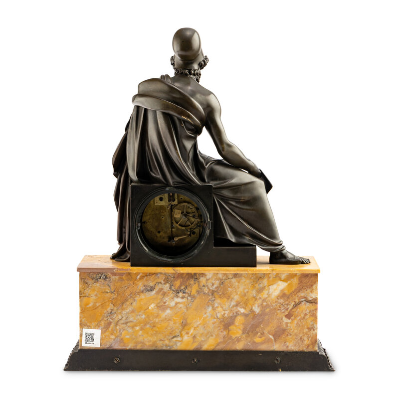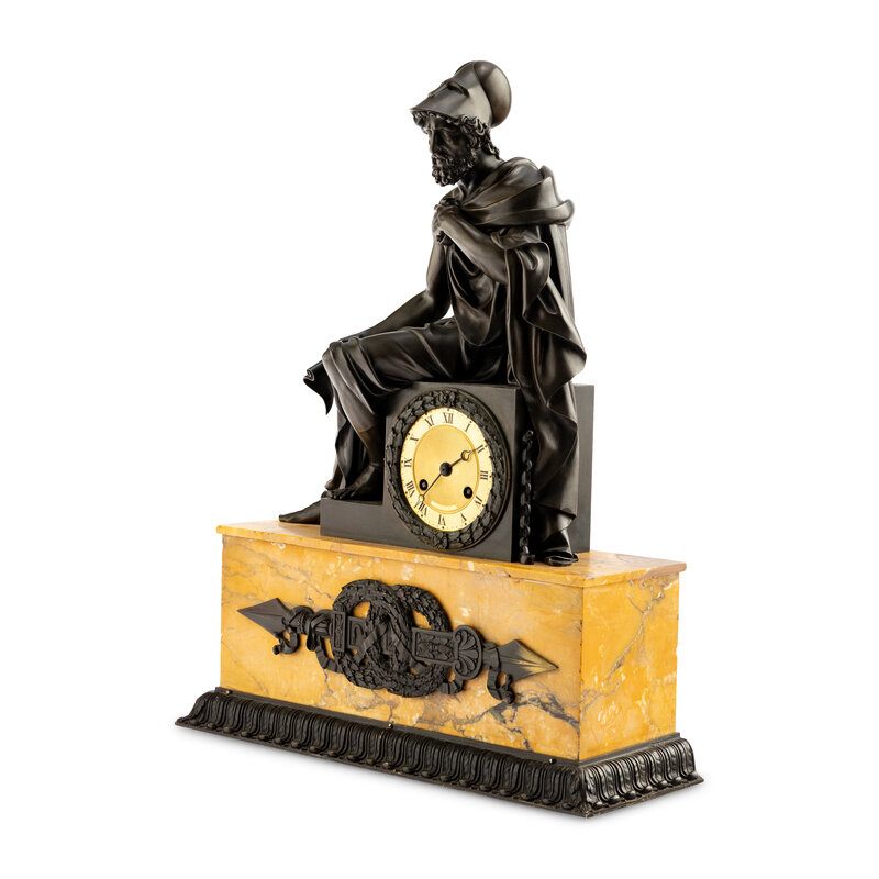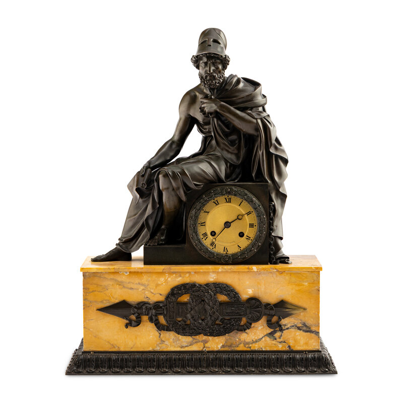 A Louis Philippe Patinated Bronze and Sienna Marble Figural Mantel Clock