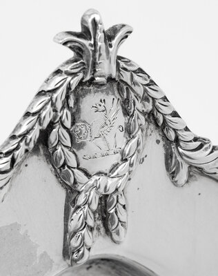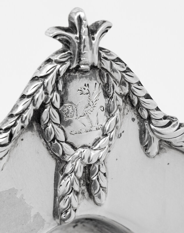 each decorated with a laurel bordered cartouche engraved with a crest of a griffin rampant holding a laurel wreath.