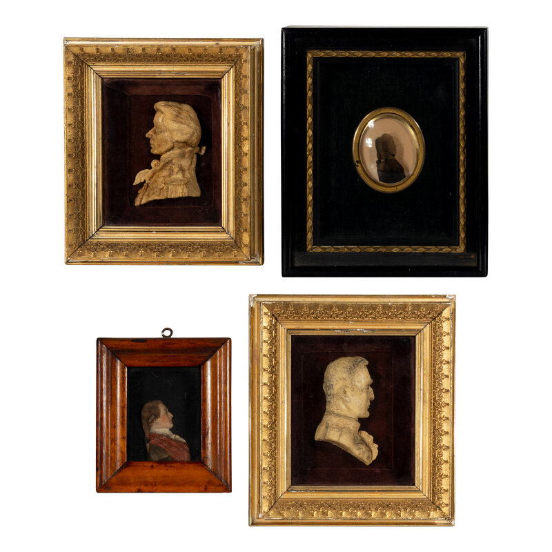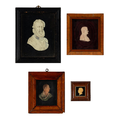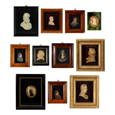 comprising mostly wax examples; depicting Samuel Johnson, Henry IV of France, Napoleon, John Hume, Charles Edward Stewart, Sir Walter Scott, Horatio Nelson, the Duke of Wellington, and three unknown sitters, together with a portrait on glass of Colonel Robert Nicholson; 12 items total.
