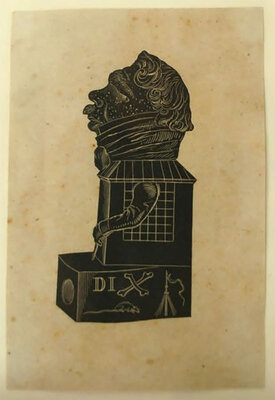 After the plaster sculpture created in 1833 by Danton, generally acknowledged as France's first caricaturist. Daguerre's distinctive visage sits atop a building which in turn sits on a camera obscura inscribed with a rebus puzzle spelling "Diorama."