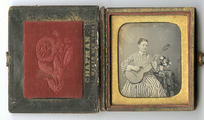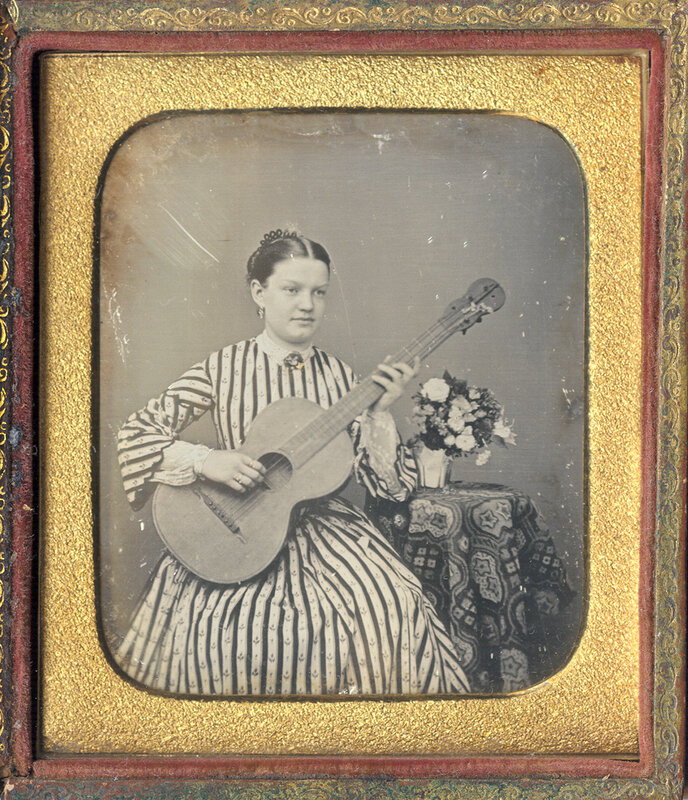 Sixth-plate daguerreotype of a happy young woman playing her guitar.