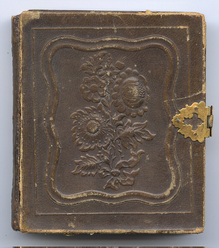 She is dressed in an unusual and lovely patterned gown with a bouquet of flowers on the table next to her. Housed in a booklet case with the gold gilded stamp for "Chapman, Case Maker New York"; separated at the hinge.