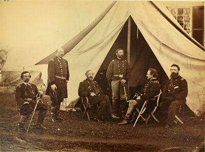 Albumen photograph taken at Meade's headquarters at Culpeper, Virginia, September, 1863. Left to right: Gouverneur K. Warren, William H. French, George G. Mead, Henry J. Hunt, Andrew A. Humphrey, and George Sykes. Print size 7.4 x 9.4", mounted on larger modern board, 13.5 x 15". Board imprinted "Abraham Lincoln Bookshop."