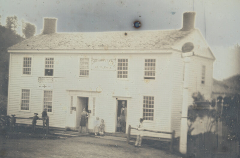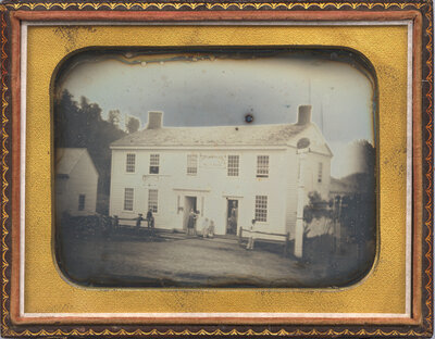 Intriguing quarter-plate daguerreotype of a 75 cent daguerreian studio with the photographer and his family posed outside.
