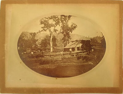 An oval vignette of a California gold-mining operation, with a cabin in the background and miners working their claim in the foreground. 6 x 8" print, mounted to larger 9 x 11" board.