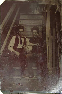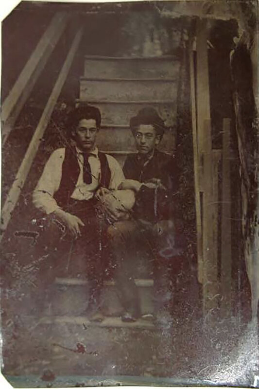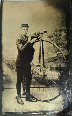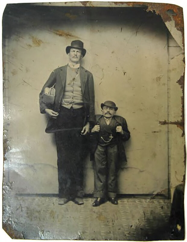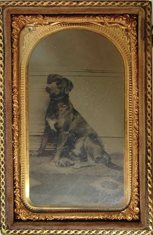 Lot of 7. Includes a sixth-plate daguerreotype of a young rooster housed in a leather case; cdv-sized portrait of a dog housed in a leather case; a cdv-size sized portrait of a grey cat; a cdv-sized tintype of two men, one holding a goose; a cdv-sized tintype a "giant" and a "little person"; and a cdv-sized tintype a young wheelman posed besides his "boneshaker" bike, inscribed on verso "Geo. S. Rollins," and an oval tintype of a young woman housed in a paper cdv-sized mat with imprint of C.A. Rundlett's Gallery, Watertown, Wisc.