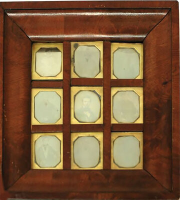 Group of 9 sixth-plate daguerreotype portraits, each with identical octagonal brass mats, housed in a fine mahogany veneer frame. Late 1840s.