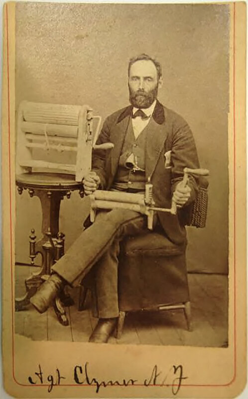 Depicts a salesman with two clothes wringing devices, identified in ink on recto, "Agt. Clymer N.J." With imprint of Bergstresser Photographer, Renovo, Pennsylvania. An unusual occupational!