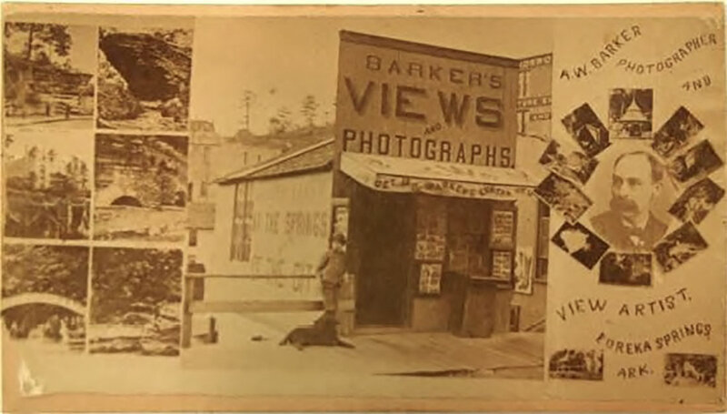 Albumen montage showing the exterior of A. W. Barker's Studio in Eureka Springs, Arkansas advertising "Views and Photographs" and a portrait of Barker surrounded by his wares. Ca. 1880s.