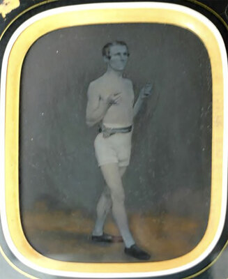 Depicts a boxer clad in trunks with his fists clenched before his chest. 4.5 x 5.5".