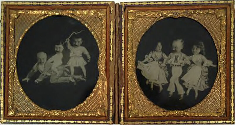 A pair of sixth-plate ambrotypes, one showing men, the other two women dancing with a man.