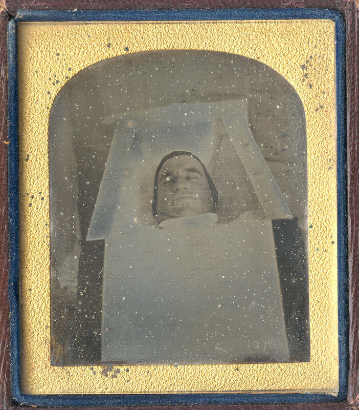 Mid- to late-1840s sixth-plate daguerreotype of a man posed in his coffin.