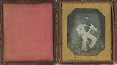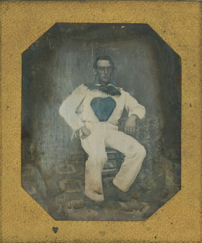 A sixth-plate daguerreotype of a sailor in his summer whites sporting a giant blue heart on his shirt.