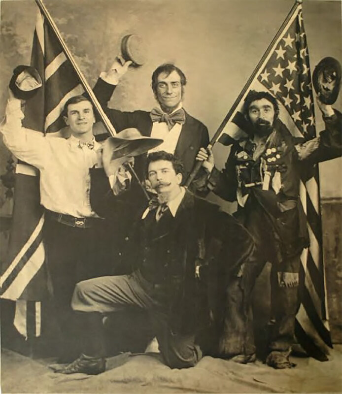 A fine studio portrait of four actors posed in costume with American and British flags, seemingly poking fun at stereotypes of regular Brits and Irishmen.