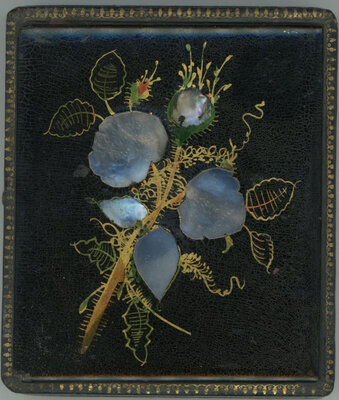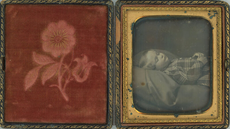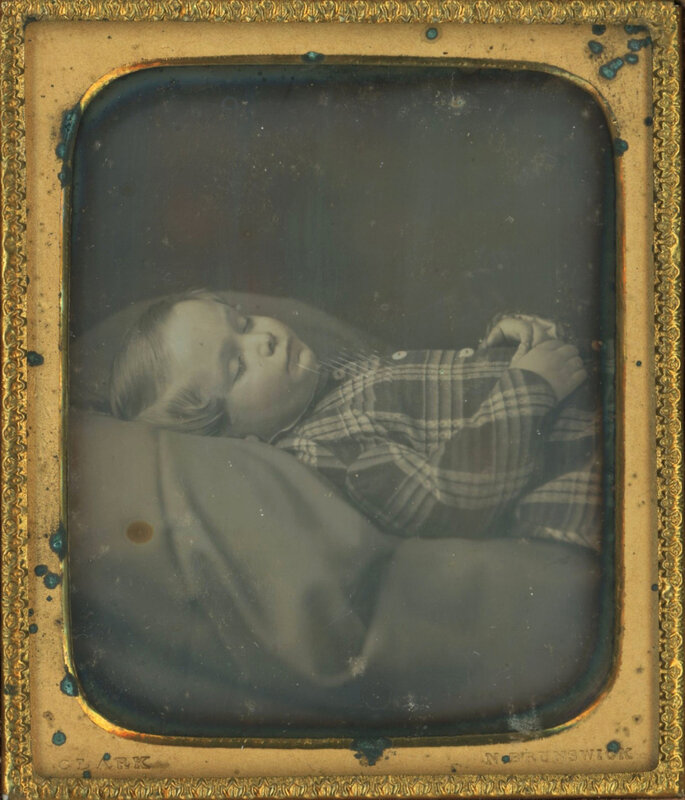 Postmortem of a child. A sixth-plate daguerreotype of a child laid to rest in his plaid outfit. Stamped " Clark, New Brunswick" on the mat. Housed in a nice black lacquer and MOP push button case.