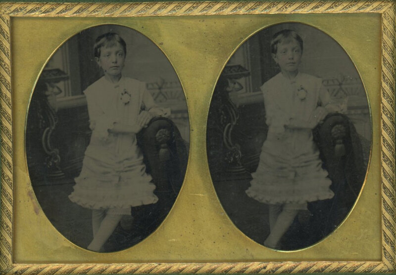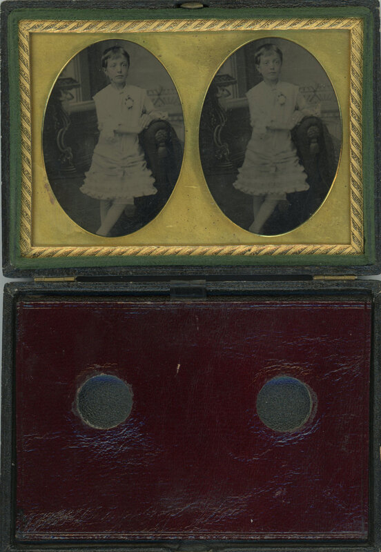 A rare stereoscopic tintype comprised of two quarter plates depicting a young girl leaning on the arm of a piece of furniture.