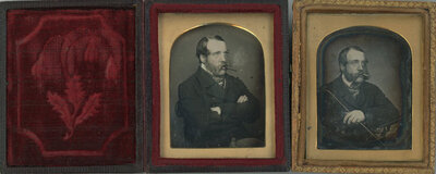 A pair of ninth-plate daguerreotypes of a man who is proud of his smoking prowess. One image is in a full case and the other a half case.