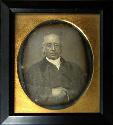 Sixth-plate image of a bespectacled older man holding a cane. Framed and glazed, 3 x 4".
