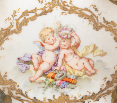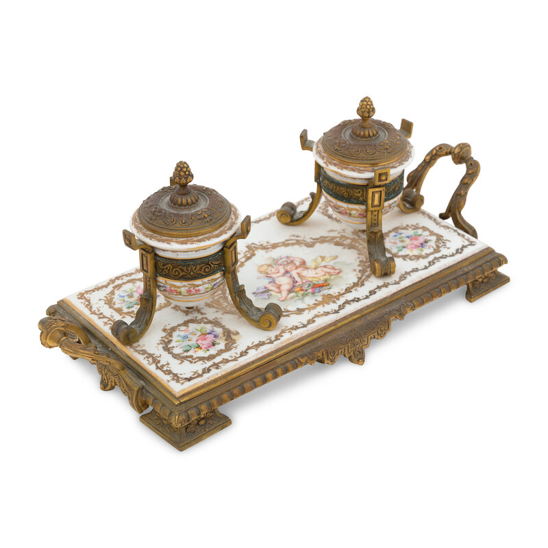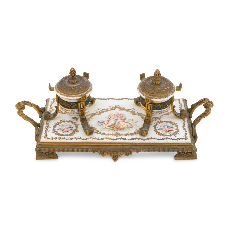 A Continental Enameled Porcelain and Gilt Metal Inkwell and Stand