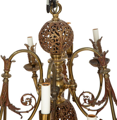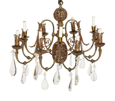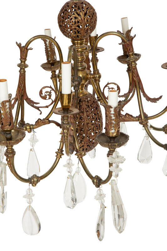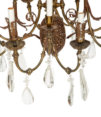 A Pierced Brass Eight-Light Chandelier with Crystal Drops