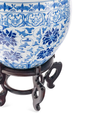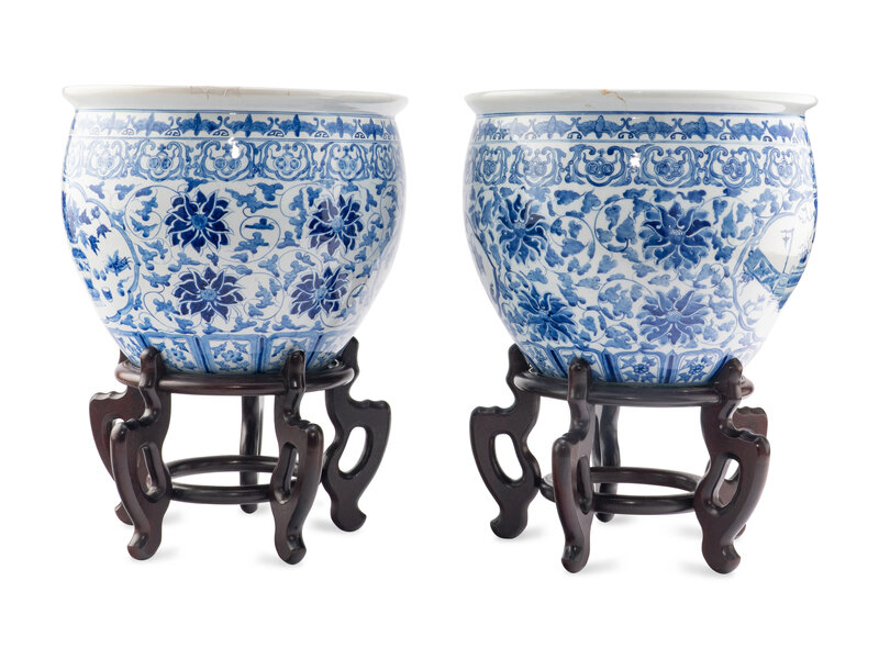A Pair of Blue and White Porcelain Jardinieres with Wood Stands