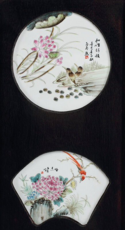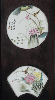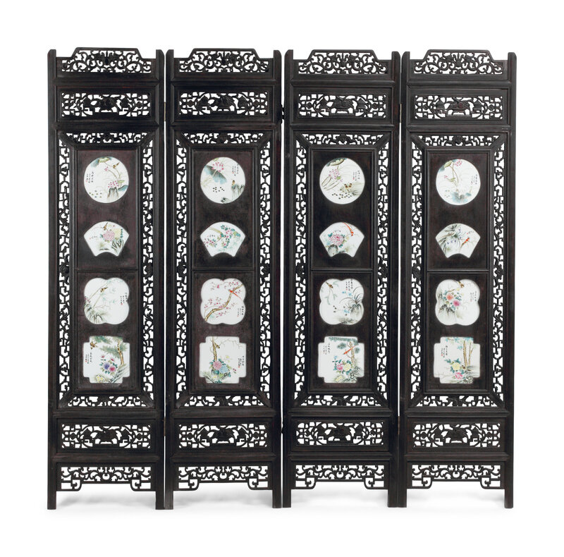 A Chinese Porcelain-Inset Carved Wood Four-Panel Screen