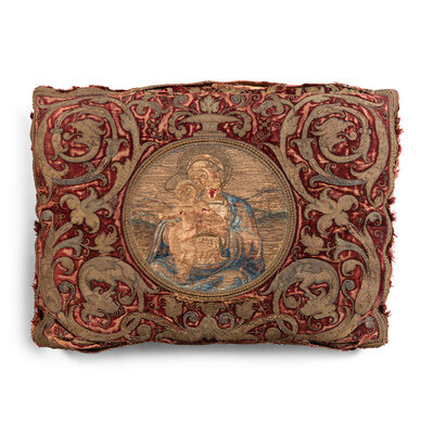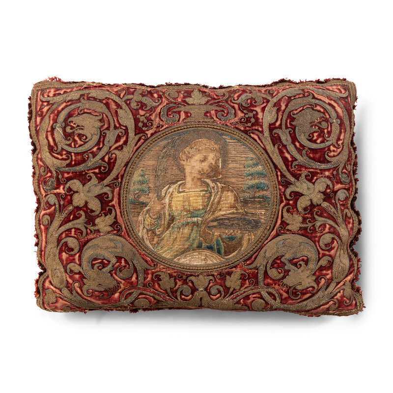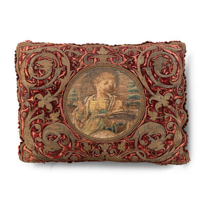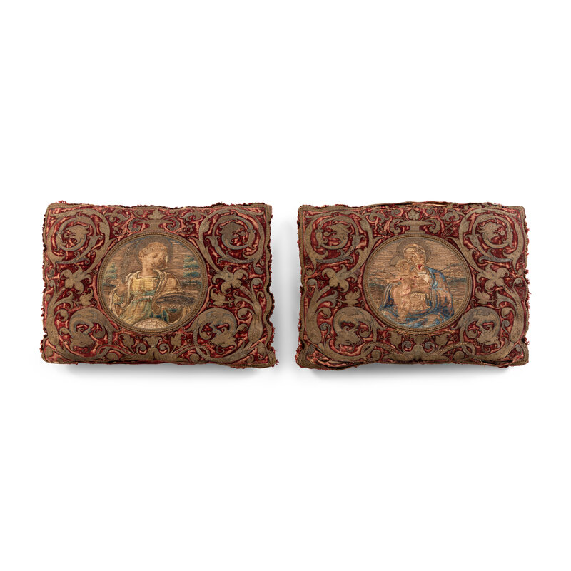 A Pair of Silk Velvet, Gold Filé and Silk Embroidered Panels, Now Mounted as Pillows