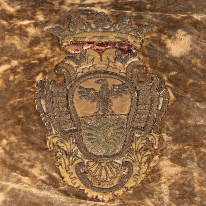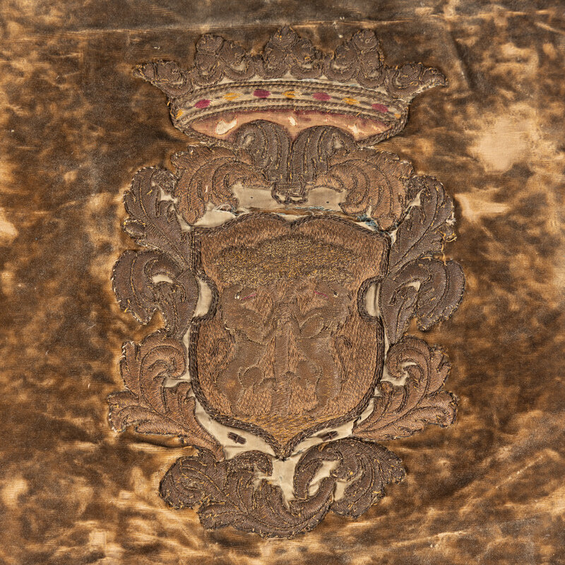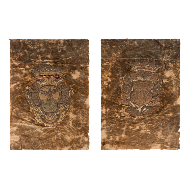 Two Velvet Panels with Silver Filé Heraldic Crest Appliqués