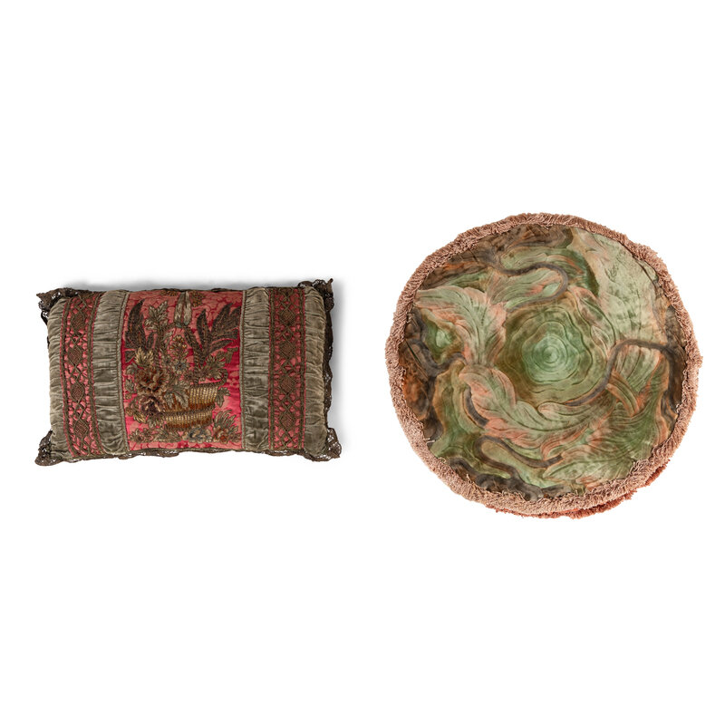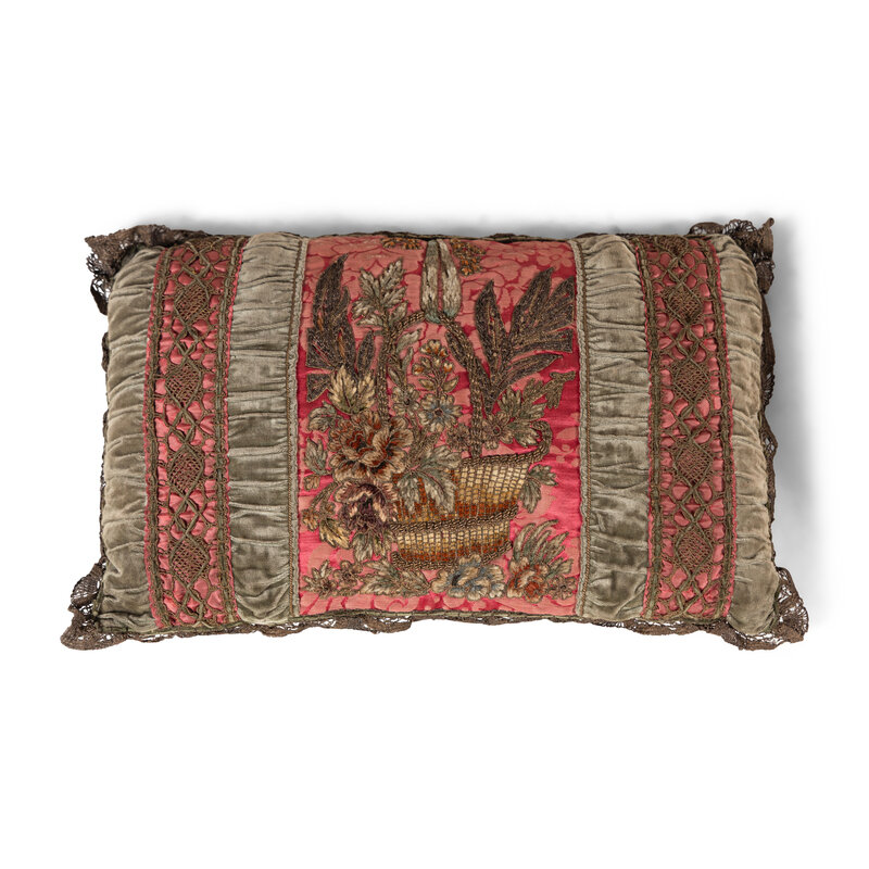 A Silk Damask and Velvet Panel with Silver Filé and Chenille Appliqué, Now worked as a Cushion, The Appliqué Probably 19th Century
