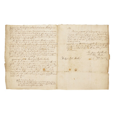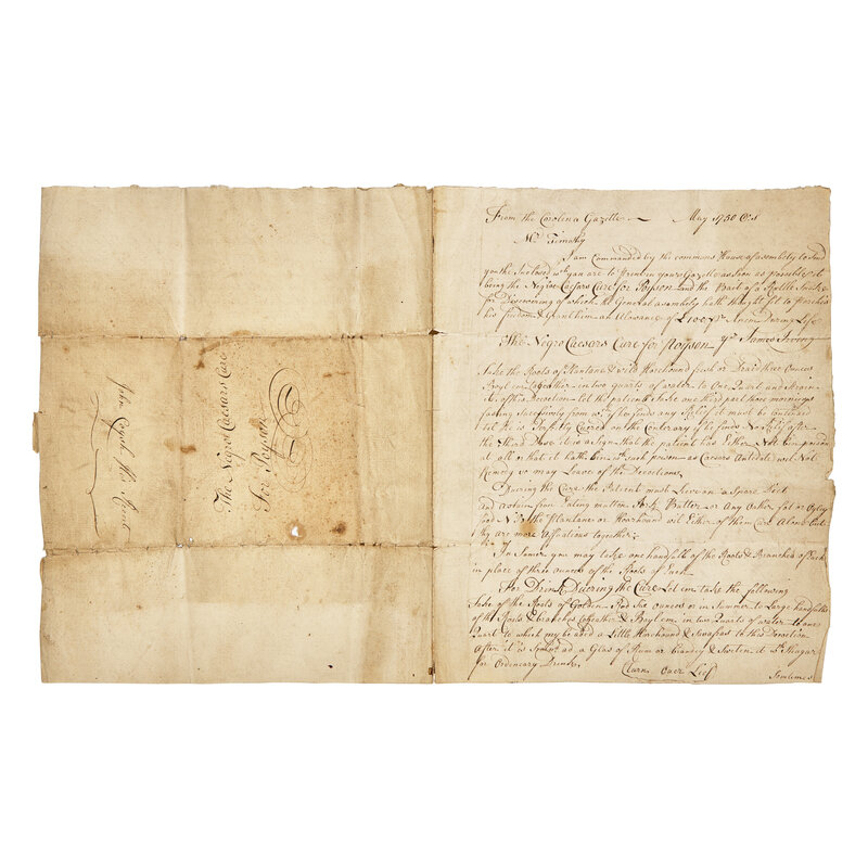 Charleston, South Carolina, ca. 1750s-60s. Bifolium, 10 3/8 x 8 1/2 in. (263 x 216 mm). Three-page autograph letter, signed by merchant John Beale to Capt. Robert Moalle, transcribing for him "The Negro Caesars Cure for Poyson", copied from an issue of the South-Carolina Gazette. Beale adds following the article, "Too asner you that the aforsd. Antedotes for the Expeling of poyson is in noways a Cheat but on the Contrary answers Expectation and wil Expel most or al Vegatable Poyson but as to Any Mineral Poyson believe wil Not but Generaly Speaking Our Negroes seldom or Never I think Not within my knowledg administer any oather but the Vegatables. I can truly Asert that Several Gentm. Residents in Chas. Town from my own knowledg have bin cuered by this antedote when thy have bin in a Desperate Condition Having Nothing farther to...and I remain...John Beale" Docketed on verso, and inscribed "John Coysh His Receit". Creasing from old folds, small holes and separations along same; wear and creasing along edges.