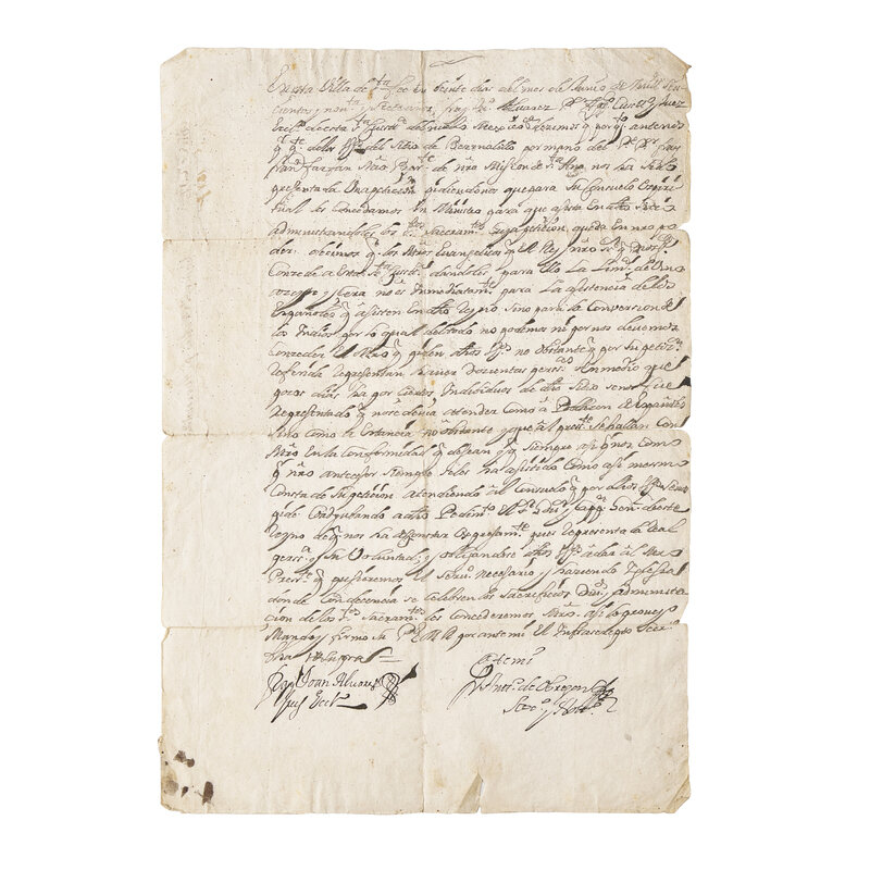 (Santa Fe, New Mexico), June 11, 1697. Single sheet, 12 1/4 x 8 1/2 in. (311 x 215 mm). Autograph document in Spanish, signed by Franciscan Father Antonio de Obregon y Alcocer, being a proclamation by Father Juan Alvarez of the Holy Custody of New Mexico, regarding the request for a Christian Minister in the village of Bernalillo. Reads in full (translated): "In this Village of Santa Fe, on the eleventh day of the month of June of the year sixteen hundred and ninety seven, I, Father Joan Alvarez, Ecclesiastical Judge of this Holy Custody of Nuevo Mexico, state that a petition of the inhabitants of the Village of Bernalillo has been presented to us through the Father Prior Francisco Farfan, Secretary of Our Mission of Santa Ana, asking to be furnished with a Minister for the their spiritual consolation and the administration of the Holy Sacraments; which petition is filed. We state in reply that the Evangelical Ministers, provided with the bottle of wine, the oil and the wax, that our Master the King (whom God may protect) has supplied us, are not for, the immediate assistance of the Spaniards living in said Kingdom, but for the conversion of the Indians; for which reason we cannot, and must not, concede the Minister that said inhabitants solicit, although the petition is signed by two hundred persons. It having, however, a few days ago been represented to us by certain individuals of the said Village that the latter ought not to be considered as a Spanish settlement, but as an "Estancia", and that they have at present a Minister in conformity with their desire, and that they have always been assisted by us, as well as by our predecessor, as it has been stated in their petition; and taking in consideration that we are asked for consolation by the said inhabitants, joining them in their petition the Governor and Captain General whose disire (sic) we hold in much consideration, as he represents the Royal person and his will; and as said inhabitants pledge themselves to provide with the necessary food the President Minister that we should concede to them, as with as to build a Church where the Devine (sic) Services and the Administration of the Holy Sacraments could be performed with decency; we concede a Minister to them. So it was provided, commanded and signed, by this Most Reverend Paternity, before me the undersigned Secretary, date as above. 'Fray Joan Alvarez' Ecclesiastical Judge Before Me 'Fray Anto de Obregon' Secretary." Contemporary docketing on verso; creasing from old folds; scattered soiling; some paper loss to margins. With a 19th-century manuscript English translation.