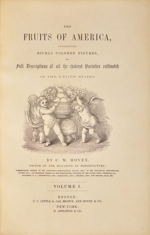 [Natural History] Hovey, C(harles).M(ason). The Fruits of America, Containing Richly Colored Figures, and Full Descriptions of all the choicest Varieties cultivated in the United States