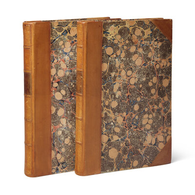 by William Sharp & Son, as well as numerous woodcut illustrations of trees, flowers, and fruit. Contemporary three-quarter tan calf over marbled paper-covered boards, brown morocco spine labels, stamped in blind and in gilt, rebacked with original spines laid down, boards rubbed; top edges gilt, other edges untrimmed; marbled endpapers; book-plate of Sidney Brooks on front endpapers of each volume. Arnold Arboretum/Harvard, p. 354; Bennett, p. 59; Nissen BBI 941; Reese, Stamped with a National Character 20