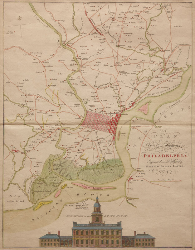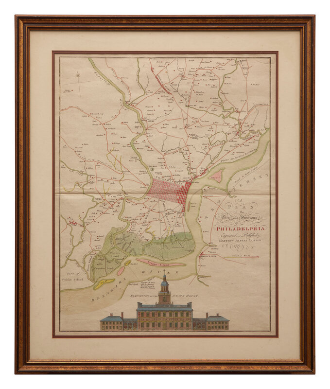 (Augsburg: Matthew Albert Lotter, 1777). Engraved hand-colored map, by Lotter after Nicholas Scull and George Heap. 26 1/2 x 19 3/4 in. (673 x 502 mm). Two small repaired closed tears along bottom edge; small repaired open tear near plate mark in upper right side; small repaired open tear at left side along central fold. In mat and in frame, 30 1/2 x 25 1/2 in. (775 x 648 mm). Snyder, City of Independence 48; Nebenzahl, Bibliography of Battle Plans of the American Revolution 131