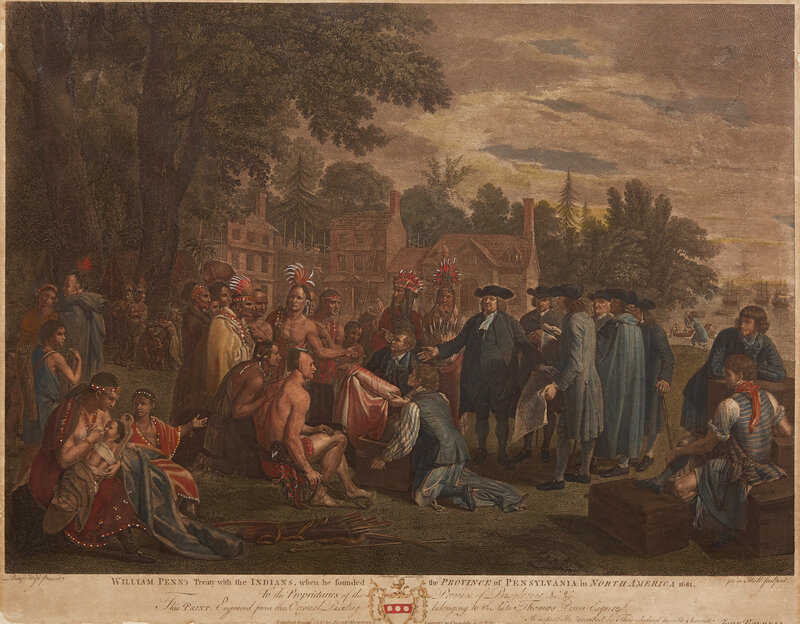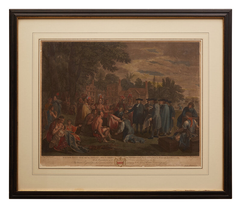 An iconic image, considered one "of the best-known prints of a Philadelphia scene" (Snyder, City of Independence, p. 252), depicting William Penn entering into the Treaty of Shackamaxon with the Lenni Lenape people, and purchasing the land that would become Pennsylvania. In 1771, to help bolster the reputation of the Penn family during a time of increasing unrest, William Penn's son, Thomas (1702-75), commissioned Benjamin West to create his allegorical painting, upon which John Boydell based his print.