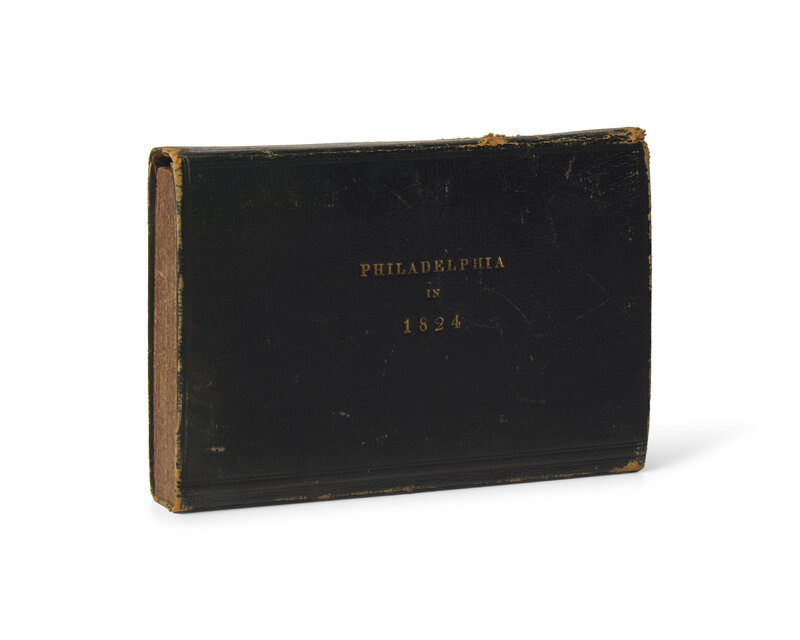 Philadelphia: H.C. Carey & I. Lea, August, 1824. 24mo. xi, (i), 238, 18 (ads) pp. Illustrated with an engraved frontispiece by C.G. Childs after F. Doughty, two engraved plans (one folding), and one large folding map with hand-colored outlining by F. Drayton ("Plan of the City of Philadelphia Compiled From Actual Survey"). Pocket book binding of flexible black morocco, front board with locking flap and loop, stamped in gilt, rubbing to boards and extremities; speckled edges; pocket at rear; light scattered spotting. Sabin 62005; Shaw & Shoemaker 17612