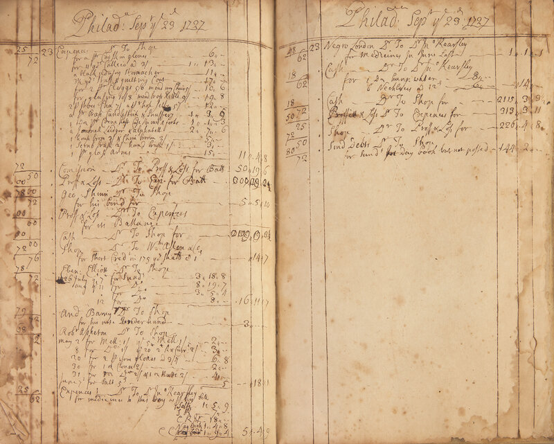 A large majority of the above men, including several public officials, either owned slaves or participated in the slave trade. Three enslaved men are mentioned within, "Negro Dick," "Negro London," and "Negro Warwick". Based on the entries within, they were solely or jointly owned by Charles Read, Abraham Haines, and the unnamed author. Upwards of 15 entries relate to these men, either in their dealings with the shop, or in other capacities. These include expenses paid by the unnamed author to Dr. John Kearsley for medicine for Dick, to furnituremaker Bernard Eaglesfield for the construction of Dick's coffin, and expenses for Dick's burial (in 1727). Transactions related to London include a purchase by London from known slave trader Thomas Sobers, payment to the author for three days work by London at an unspecified church, and expenses to Dr. Kearsley for medicine for London. For Warwick, the possible transaction of his purchase is noted on September 16, 1726: "Expenses Dr to Cash for a Negro Named Warwick abt 17 yrs of age"; Warwick's expenses are noted as being paid by Haines, while a December 31, 1726 entry records "for Sund. Che & Exp on Negro Warwick as his running away…"