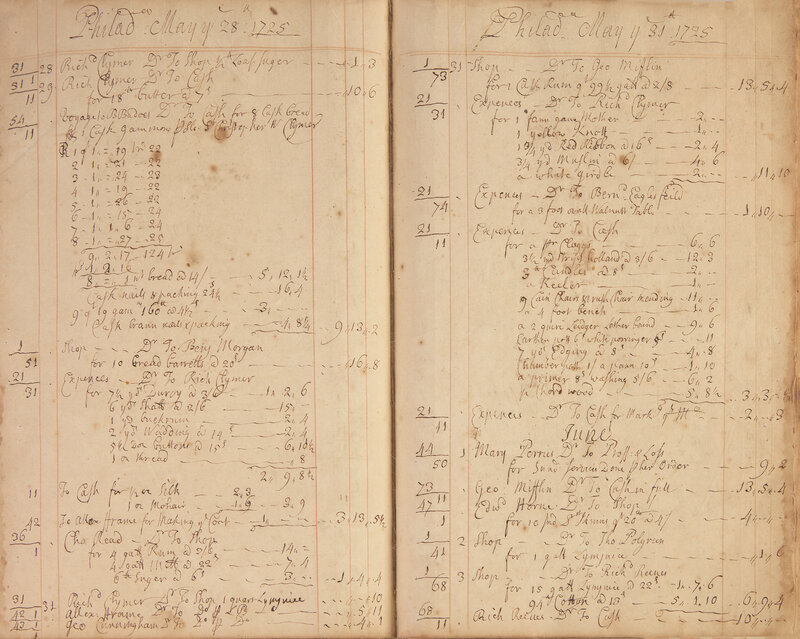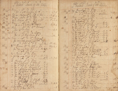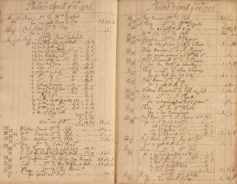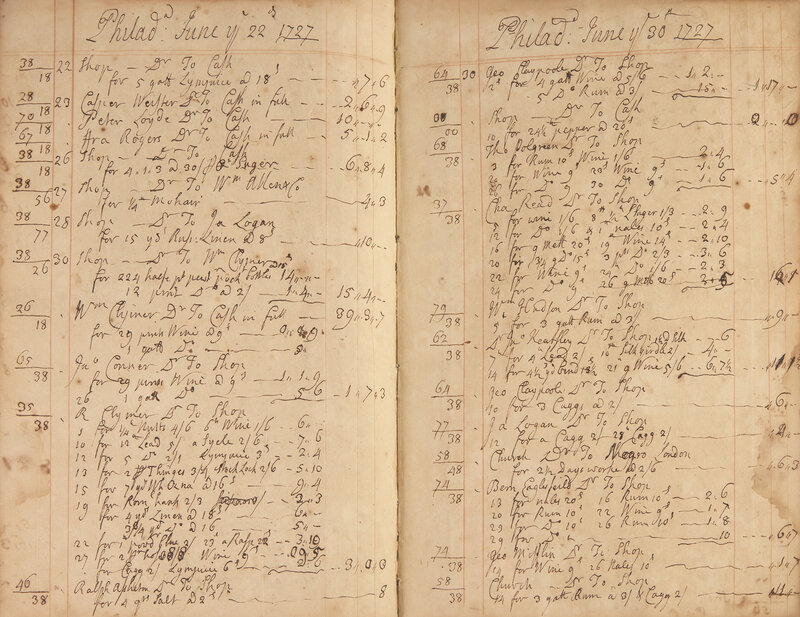 Several individuals appear as recurring patrons, the most frequent being shipping merchant and shipwright Richard Clymer (1685-1734)--the grandfather of Signer of the Declaration of Independence from Pennsylvania, George Clymer (1739-1813). Based on the evidence within, it is possible that the author of the manuscript and Clymer had reciprocal business arrangements, possibly through Clymer's outfitting or commissioning of ships for trade (a William Clymer, possibly his brother or son, is recorded as commanding ships to the aforementioned locations, with expenses noted for his freights). Their transactions count in the dozens over the entire period represented, recording the purchase of items such as rum, rice, vinegar, lime juice, fishhooks, bottles, butter, cotton, wadding, ship's flannel, calamanco, brass kettles, sugar, wine glasses, cheese, muslin, a child's calico gown, silk, hobnails, redwood, pork, and more. The second most frequent patron is Charles Read, Jr. (1686-1736), a prominent early merchant and public official who served as an assemblyman, alderman, sheriff, and as the 20th mayor of Philadelphia, from 1726-27 (also a close relation to Deborah Read, wife of Benjamin Franklin). Their dozens of transactions include the purchase of rum, ginger, cotton, wine, mohair, brass buttons, Osnaburg cloth, long pipes, and expenses for the mending of his shoes.