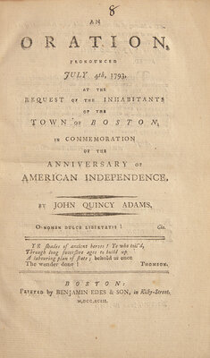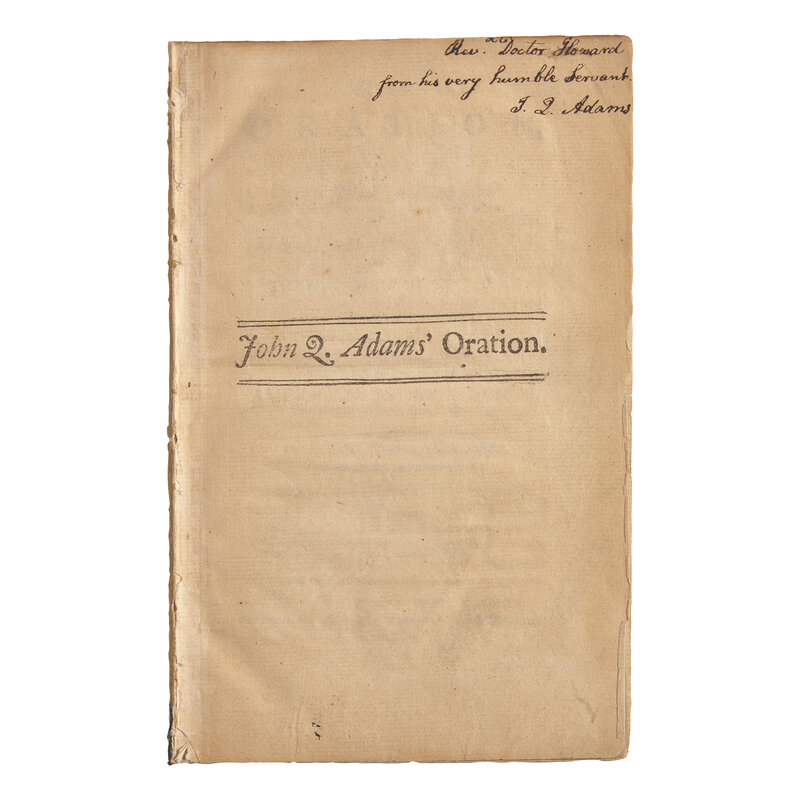 A fine presentation copy of 25-year-old John Quincy Adams's Fourth of July oration in Boston in 1793. Inscribed to Rev. Dr. Simeon Howard (1733-1804), a Boston Unitarian Congregational minister and close friend of the Adams family.