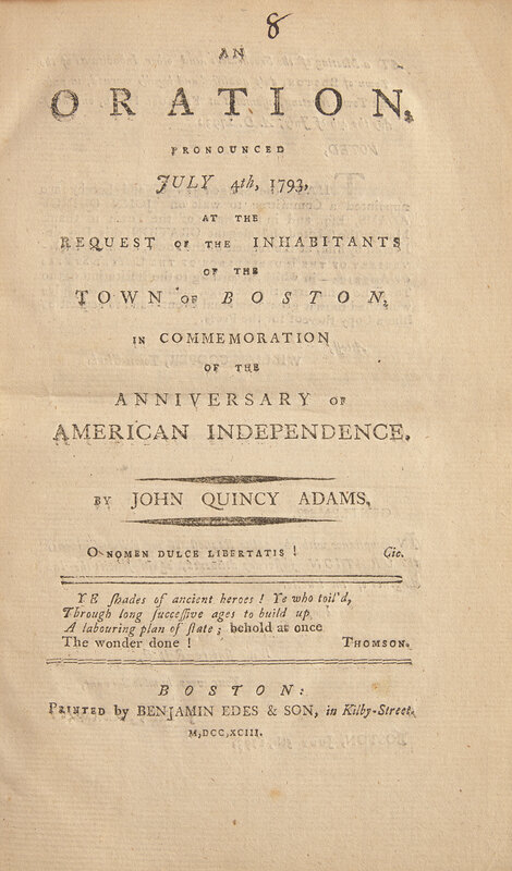 [Presidential] Adams, John Quincy. An Oration, Pronounced July 4th, 1793, at the Request of the Inhabitants of the Town of Boston, in Commemoration of the Anniversary of American Independence