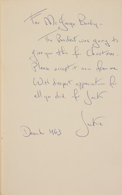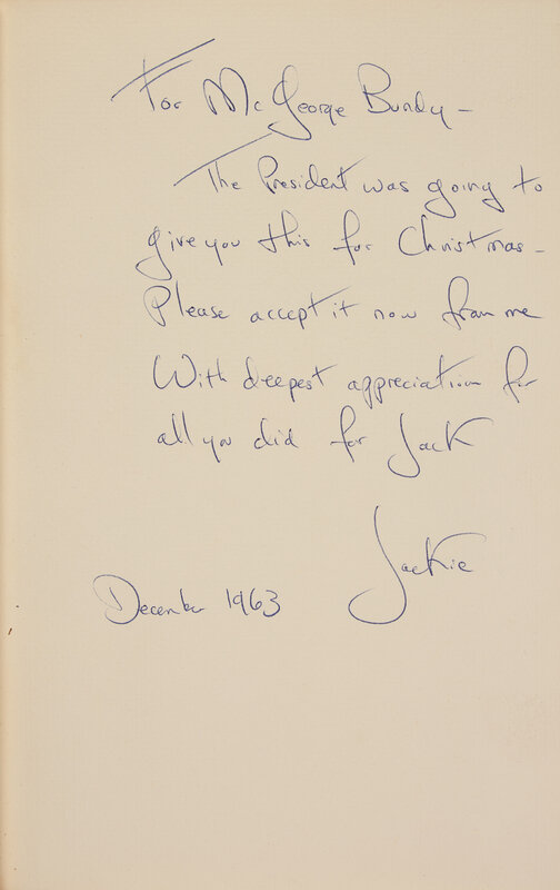 A fine and very scarce presentation copy, pointedly inscribed by Jacqueline Kennedy shortly after her husband's assassination on November 22, 1963. Presented as a Christmas gift to McGeorge Bundy (1919-96), United States National Security Advisor to both President Kennedy and President Lyndon B. Johnson, and one of the main architects of their foreign policy agendas.