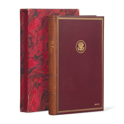 Washington, D.C.: United States Government Printing Office, 1961. Limited edition, one of only 85 unnumbered and specially bound copies. Presentation copy, inscribed by Jacqueline Kennedy on front blank to U.S. National Security Advisor McGeorge Bundy: "For McGeorge Bundy--The President was going to give you this for Christmas--Please accept it now from me With deepest appreciation for all you did for Jack Jackie December 1963". 8vo. vi, 270 pp. Illustrated with engraved portraits. Original full burgundy calf presentation binding, decorated in gilt, presidential seal stamped in gilt on front board, Bundy's initials stamped in gilt on same ("McG.B."), spine browned, front joint cracked and tender; all edges gilt; marbled endpapers; in matching marbled paper-covered board slip case.