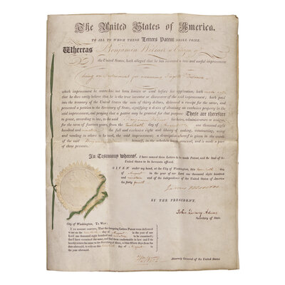 Washington, D.C. August 20, 1819. Three vellum sheets, stab sewn with green silk ties, 14 3/4 x 11 in. (375 x 279 mm). Partially-printed document, signed by James Monroe as President of the United States, and John Quincy Adams as Secretary of State, being an official Letters Patent for Benjamin Wilmer, inventor of "an Instrument for measuring Heights & Distances." Counter-signed by Attorney General William Wirt, as well as Wilmer, at bottom. Second in third sheets comprising autograph patent schedule, signed by Wilmer. Original paper seal and silk ties intact. Creasing from old folds; leaves variously soiled. Elliot, William. A List of Patents Granted by the United States...1790-1820, p. 27