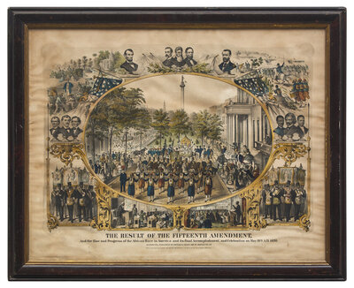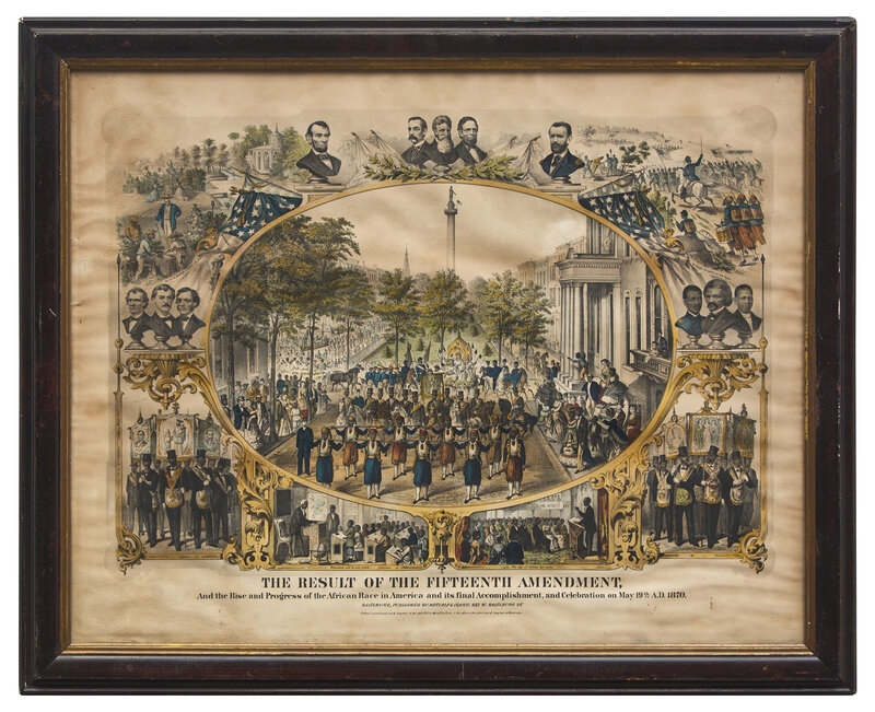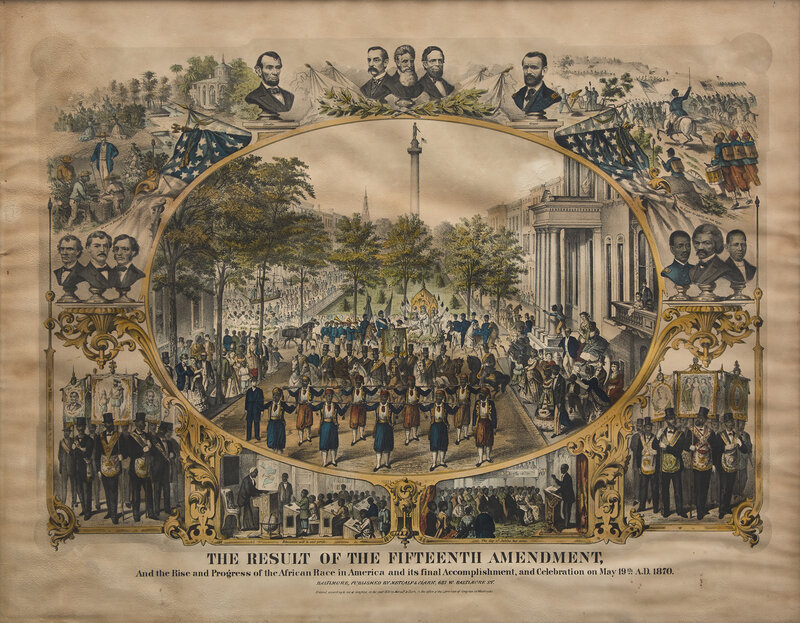 A jubilant celebration for American Civil Rights after the passage of the 15th Amendment, this print depicts a parade held in Mount Vernon Place in Baltimore, Maryland, on May 19, 1870. The parade is comprised of Black Zouaves, some on horseback, striding down Monument Street from the Washington Monument in Baltimore, as the sidewalks are lined with African American onlookers. Along the margins are a series of vignettes depicting key figures such as Thaddeus Stevens, Charles Sumner, John Brown, Presidents Lincoln and Grant, and Frederick Douglass.