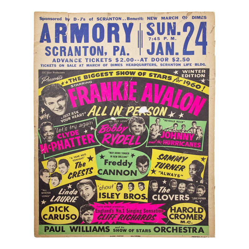 Concert poster for "The Biggest Show of Stars for 1960!", with performances by Frankie Avalon, Clyde McPhatter, Bobby Rydell, Johnny and the Hurricanes, The Crests, Freddy Cannon, Sammy Turner, Linda Laurie, Isley Brothers, The Clovers, Dick Caruso, and "Extra added attraction..England's No. 1 Singing Sensation" Cliff Richards, hosted by Harold Cromer with Paul Williams and his show of stars Orchestra.
