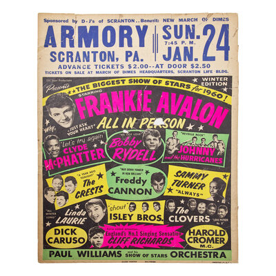 Armory, Scranton, Pennsylvania, Sunday, January 24, 1960. Concert poster, printed on thick cardstock by Globe Poster, Baltimore. Scattered wear; open tear with some loss to letters at center; scattered closed tears along edges. 22 3/4 x 17 1/4 in. (578 x 438 mm).