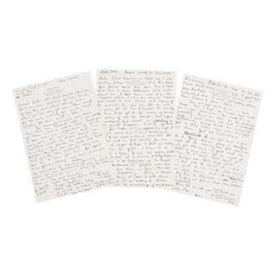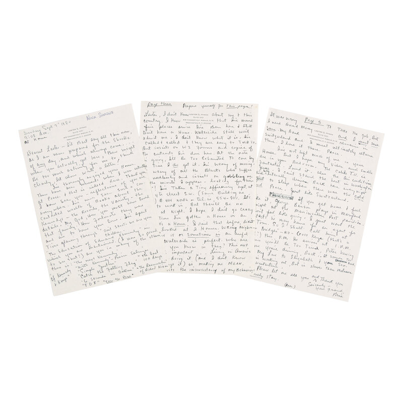 A lengthy, wide-ranging, and at times very revealing autograph letter by iconic American pianist, singer, songwriter, and civil rights activist Nina Simone, written to her friend, supporter, and attorney, Lester S. Hyman. Hyman and Simone first encountered each other in 1968, when Hyman booked Simone to play at a Massachusetts Democratic party event. Later in the 1970s and 80s, Hyman frequently invited Simone to stay at his home in Washington, D.C., when she was passing through town, and it is where she wrote the above letter for him upon his return from a trip.